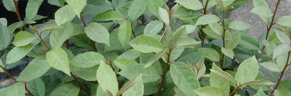 A large, dense, rounded evergreen shrub with broad, leathery, dark or metallic sea-green leaves, silvery scaly beneath, and small, fragrant white flowers in autumn
